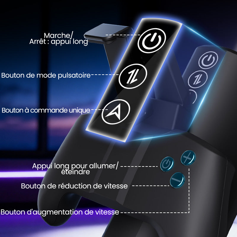 Trois boutons de précision sur la poignée et trois boutons sur l'appareil pour une utilisation simple et flexible. Maîtrisez pleinement votre rythme et votre plaisir.